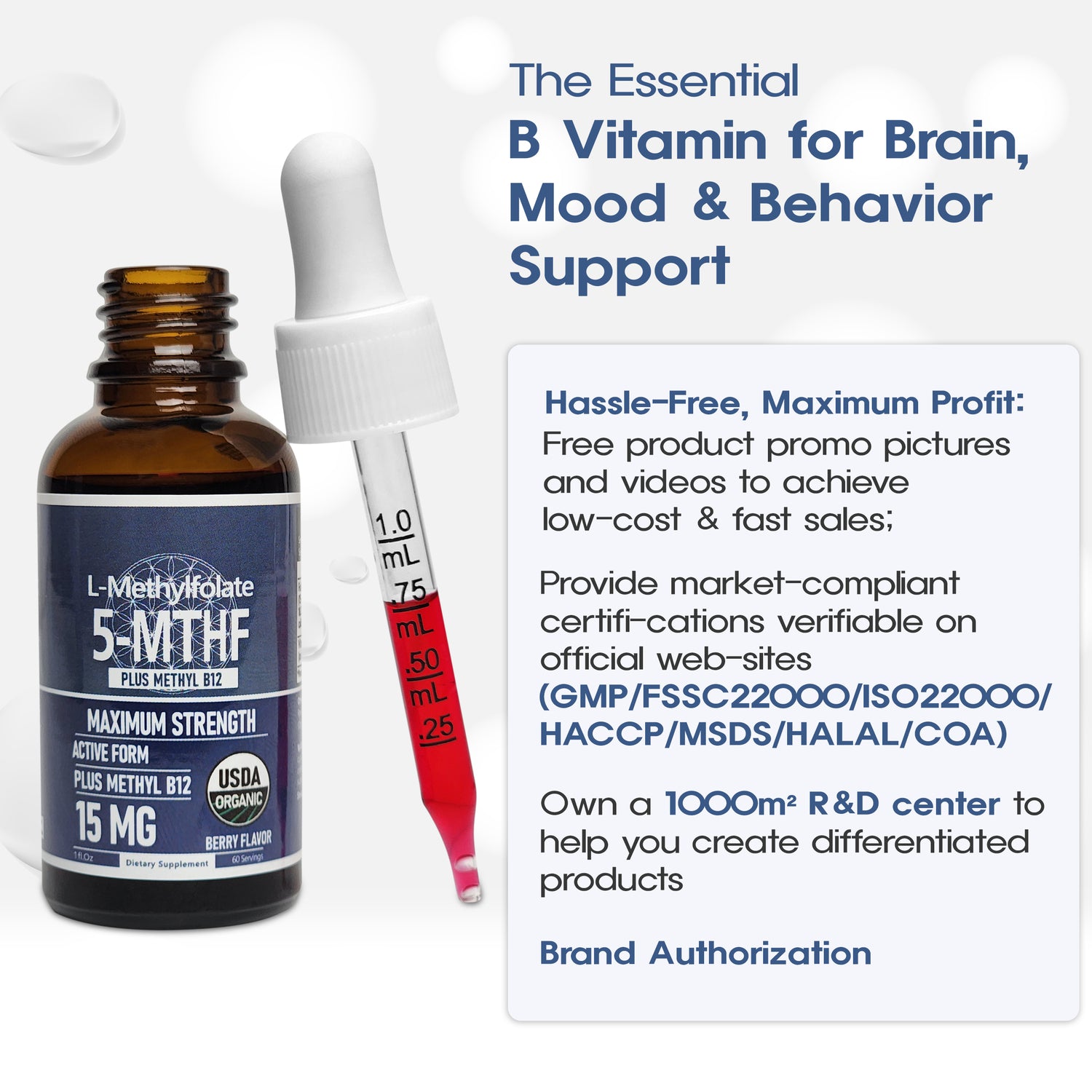 Unlike regular folic acid, L-Methylfolate (5-MTHF) is the active form of Folate that your body can immediately use. This makes it especially effective for people who have difficulty processing folic acid. Our sublingual liquid formula provides faster absorption than pills, so you feel the benefits sooner.